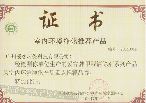 室內環(huán)境凈化推薦產品榮譽證書